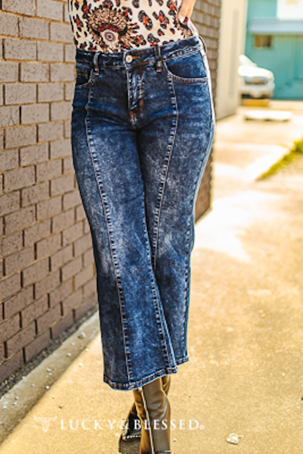 Dark Wash Crease Crop Flare Jeans (Tummy Control)