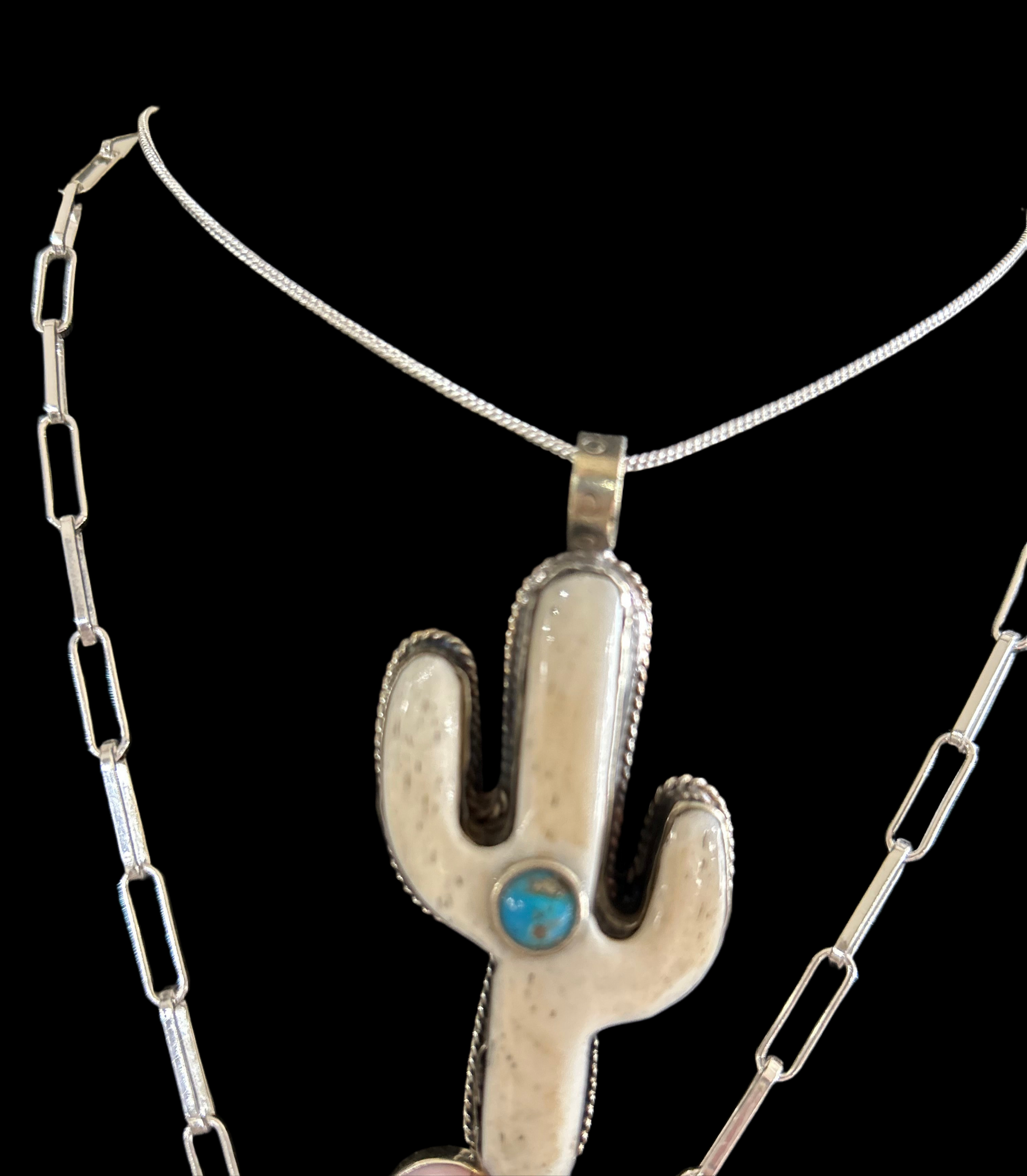 Handmade buffalo bone & turquoise cactus pendant/necklace