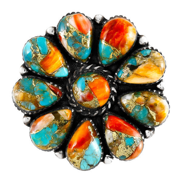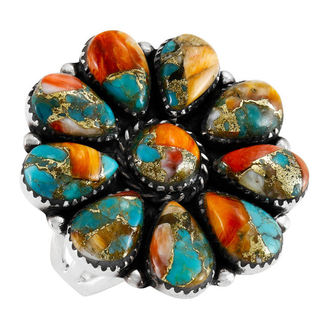 Ring in Sterling Silver & a fusion of genuine Turquoise and Spiny Oyster. Due to the nature of this mix of stones, DRAMATIC VARIATIONS in colors/shades/matrix will exist.