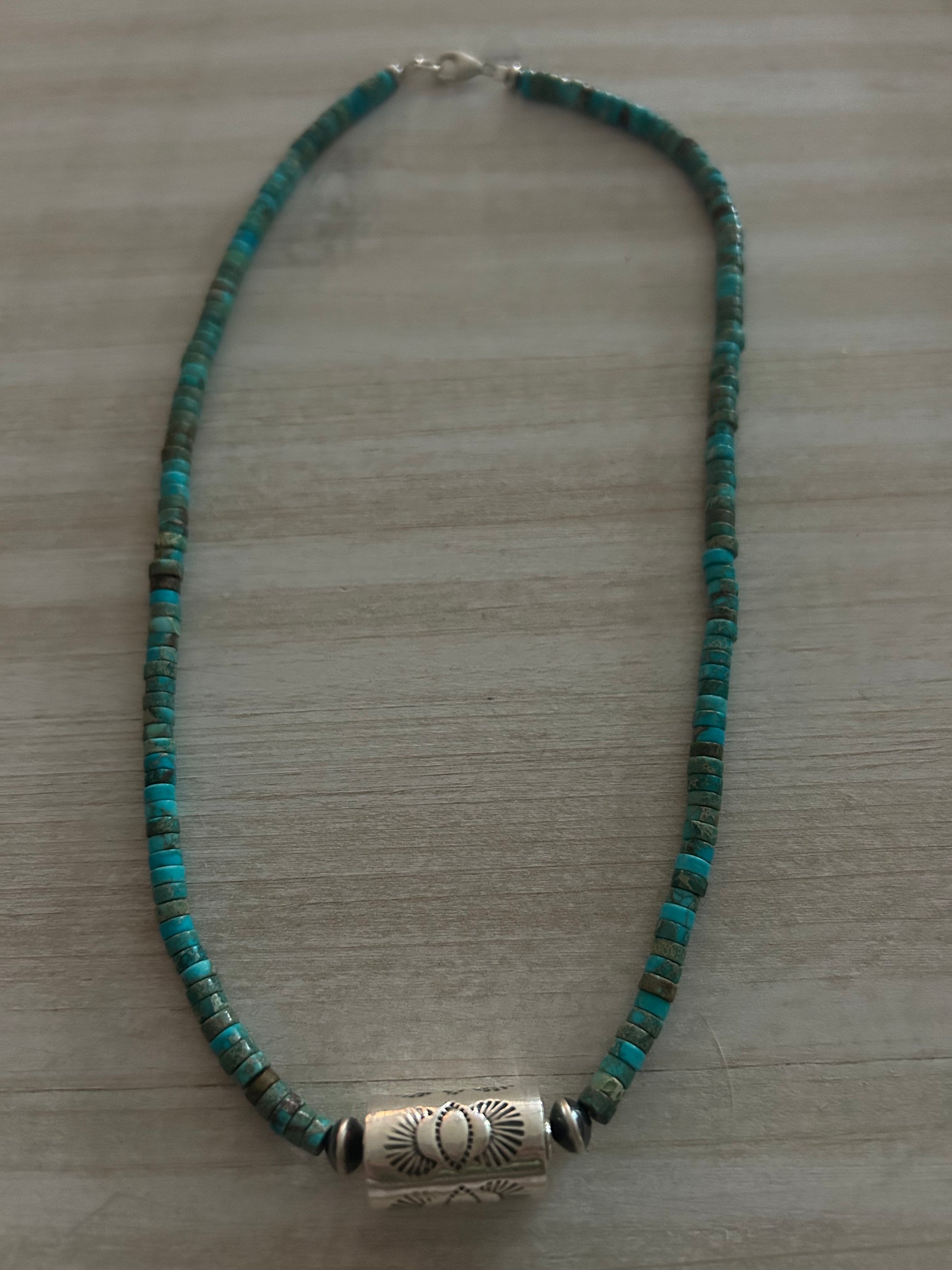 Kingman turquoise & stamped shotgun shell native made necklace